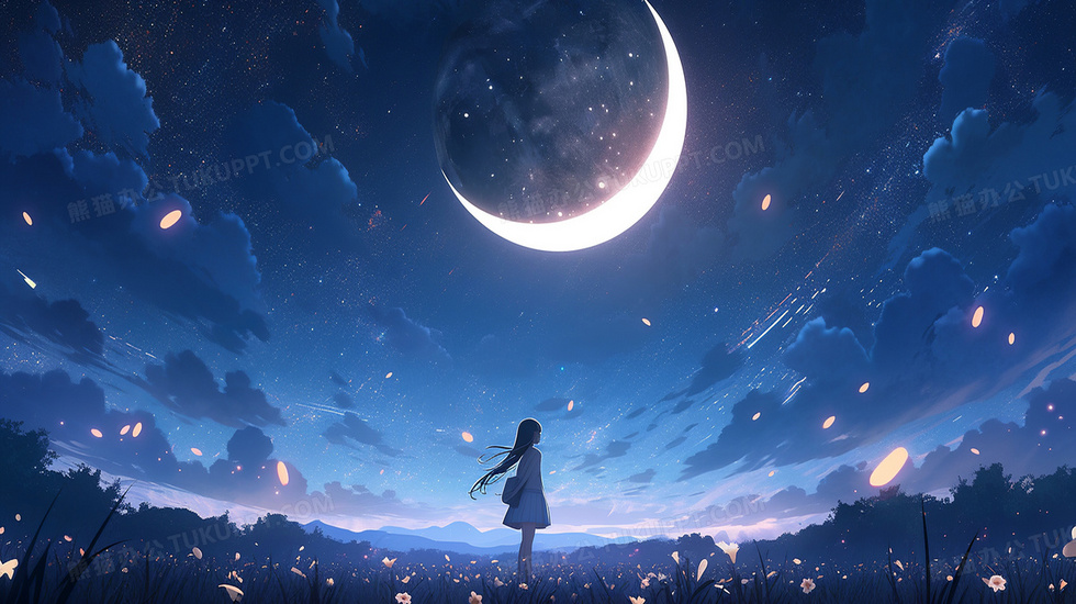 本作品内容为梦幻背景可爱的小女孩在草丛中看月亮的插画, 格式为 jpg, 大小3 MB, 图片尺寸为2912 x 1632, 源文件无水印, 欢迎使用熊猫办公。 如认为平台内容涉嫌侵权,可通过邮件:tousu@tukuppt.com提出书面通知,我们将及时处理。