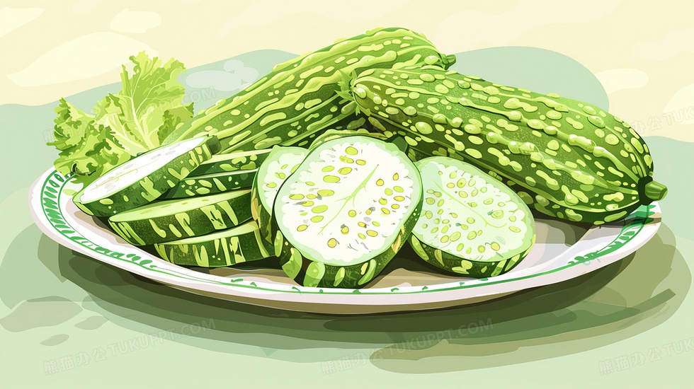 本作品内容为盘子里的美食苦瓜插画, 格式为 jpg, 大小3 MB, 图片尺寸为2912 x 1632, 源文件无水印, 欢迎使用熊猫办公。 如认为平台内容涉嫌侵权,可通过邮件:tousu@tukuppt.com提出书面通知,我们将及时处理。