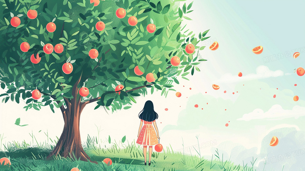 本作品内容为绿色草丛上一个女孩子在果树下看风景插画, 格式为 jpg, 大小3 MB, 图片尺寸为2912 x 1632, 源文件无水印, 欢迎使用熊猫办公。 如认为平台内容涉嫌侵权,可通过邮件:tousu@tukuppt.com提出书面通知,我们将及时处理。