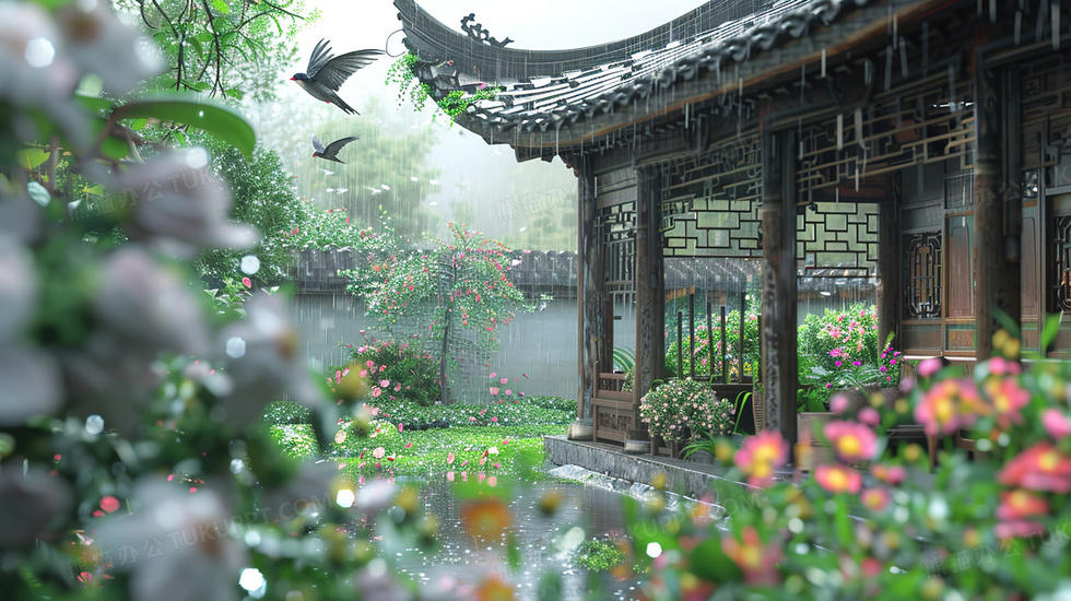 本作品内容为雨中的古典园林插画, 格式为 jpg, 大小3 MB, 图片尺寸为2912 x 1632, 源文件无水印, 欢迎使用熊猫办公。 如认为平台内容涉嫌侵权,可通过邮件:tousu@tukuppt.com提出书面通知,我们将及时处理。