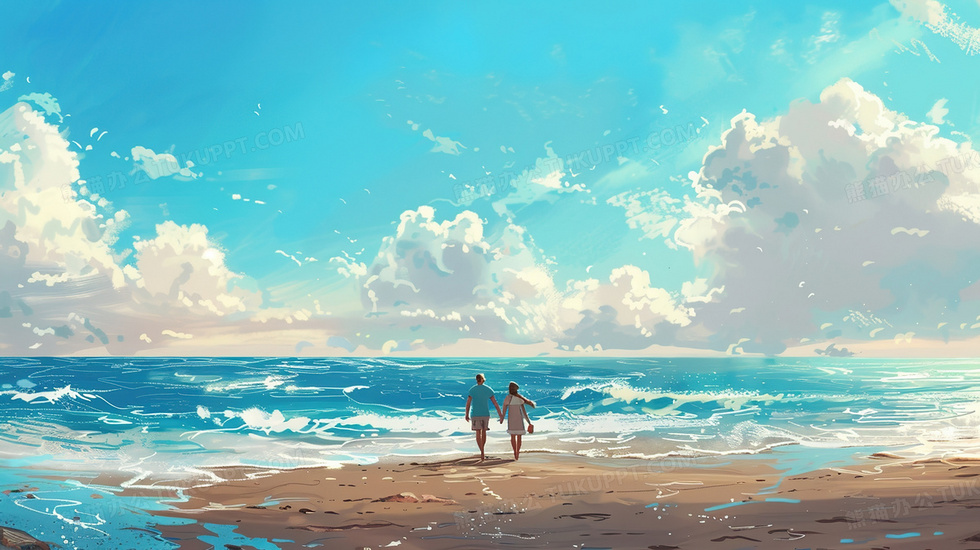 本作品内容为夏天情侣海边度假插画, 格式为 jpg, 大小3 MB, 图片尺寸为2912 x 1632, 源文件无水印, 欢迎使用熊猫办公。 如认为平台内容涉嫌侵权,可通过邮件:tousu@tukuppt.com提出书面通知,我们将及时处理。