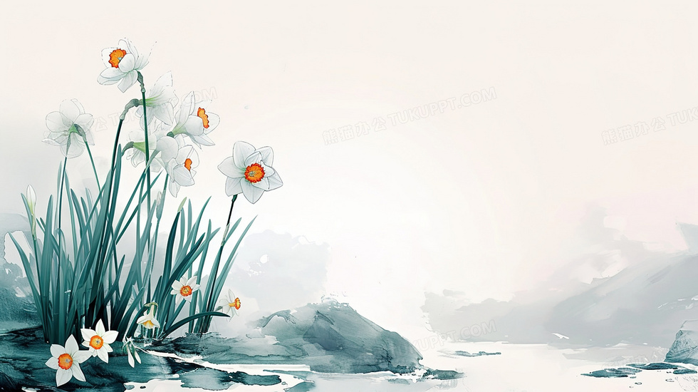 本作品内容为水仙花装饰水墨插画, 格式为 jpg, 大小2 MB, 图片尺寸为2912 x 1632, 源文件无水印, 欢迎使用熊猫办公。 如认为平台内容涉嫌侵权,可通过邮件:tousu@tukuppt.com提出书面通知,我们将及时处理。