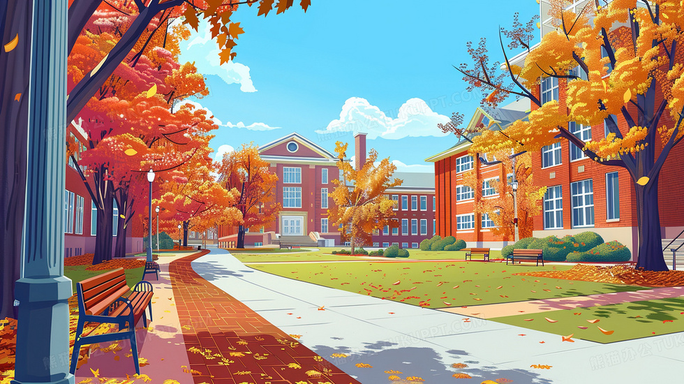 本作品内容为满地落叶的校园场景插画, 格式为 jpg, 大小4 MB, 图片尺寸为2912 x 1632, 源文件无水印, 欢迎使用熊猫办公。 如认为平台内容涉嫌侵权,可通过邮件:tousu@tukuppt.com提出书面通知,我们将及时处理。