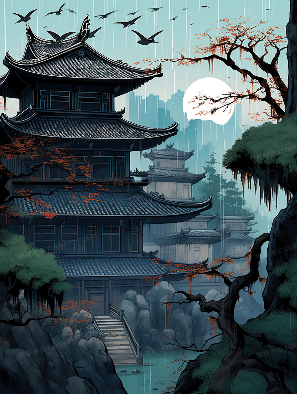 本作品内容为中国风古风山水建筑插画, 格式为 jpg, 大小3 MB, 图片尺寸为1856 x 2464, 源文件无水印, 欢迎使用熊猫办公。 如认为平台内容涉嫌侵权,可通过邮件:tousu@tukuppt.com提出书面通知,我们将及时处理。