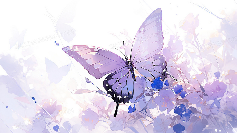 本作品内容为唯美紫色水彩花丛飞舞蝴蝶插画, 格式为 jpg, 大小2 MB, 图片尺寸为2912 x 1632, 源文件无水印, 欢迎使用熊猫办公。 如认为平台内容涉嫌侵权,可通过邮件:tousu@tukuppt.com提出书面通知,我们将及时处理。