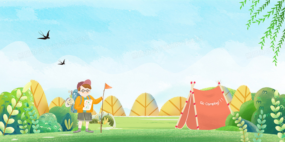 本作品内容为插画露营野炊探险夏令营卡通背景, 格式为 psd, 大小52 MB, 图片尺寸为4724 x 2362, 作品中背景图片无需修改, 源文件无水印,可以直接使用, 欢迎使用熊猫办公。 如认为平台内容涉嫌侵权,可通过邮件:tousu@tukuppt.com提出书面通知,我们将及时处理。