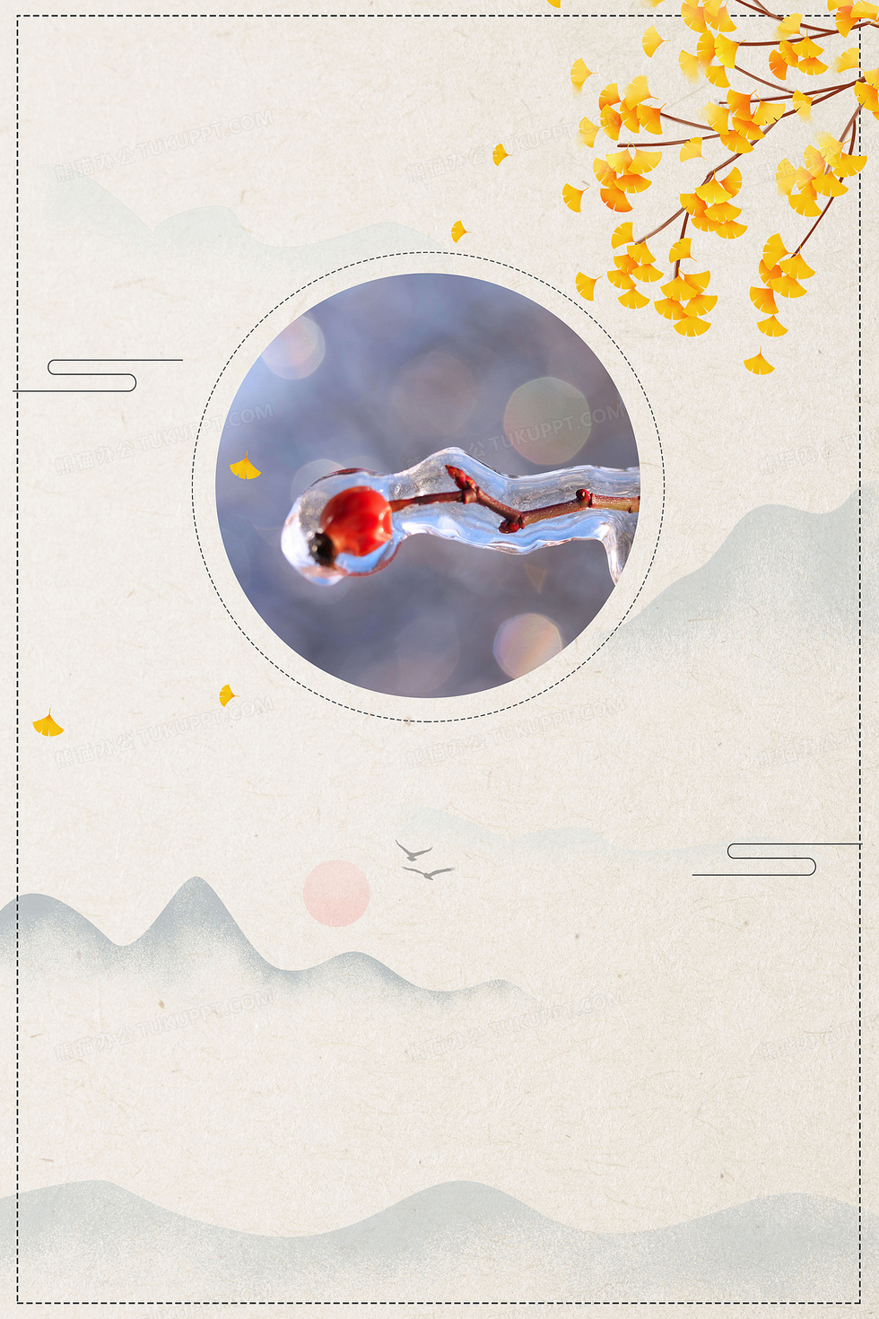 本作品内容为中国风二十四节气霜降山水银杏背景, 格式为 psd, 大小259 MB, 图片尺寸为7086 x 10631, 作品中背景图片无需修改, 源文件无水印,可以直接使用, 欢迎使用熊猫办公。 如认为平台内容涉嫌侵权,可通过邮件:tousu@tukuppt.com提出书面通知,我们将及时处理。