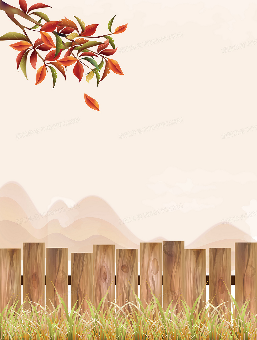 本作品内容为矢量秋季红叶木栅栏手绘风景背景, 格式为 ai, 图片尺寸为6202 x 8206, 作品中背景图片无需修改, 源文件无水印,可以直接使用, 欢迎使用熊猫办公。 如认为平台内容涉嫌侵权,可通过邮件:tousu@tukuppt.com提出书面通知,我们将及时处理。