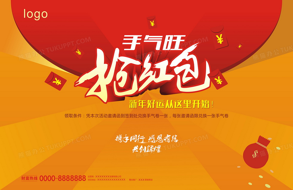 本作品内容为抢红包活动海报矢量背景素材, 格式为 cdr, 图片尺寸为5444 x 3528, 作品中背景图片无需修改, 源文件无水印,可以直接使用, 欢迎使用熊猫办公。 如认为平台内容涉嫌侵权,可通过邮件:tousu@tukuppt.com提出书面通知,我们将及时处理。