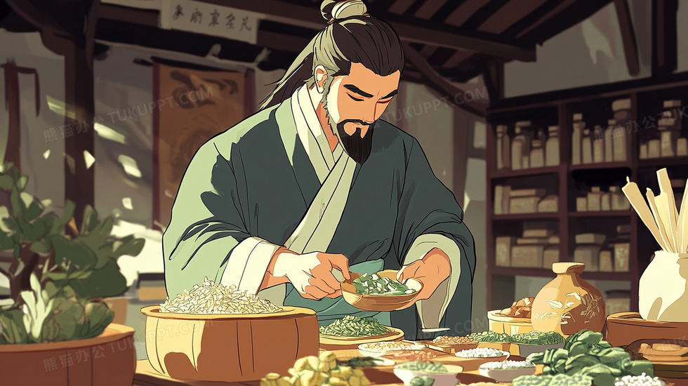 本作品内容为中国风人物中医中药插画, 格式为 jpg, 大小3 MB, 图片尺寸为2912 x 1632, 源文件无水印, 欢迎使用熊猫办公。 如认为平台内容涉嫌侵权,可通过邮件:tousu@tukuppt.com提出书面通知,我们将及时处理。