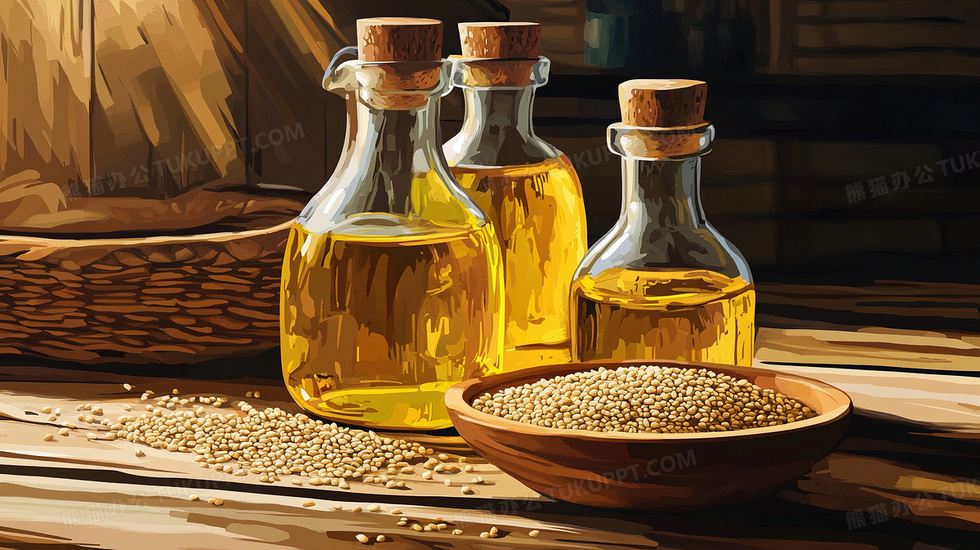 本作品内容为农副产品芝麻油香油插画, 格式为 jpg, 大小3 MB, 图片尺寸为2912 x 1632, 源文件无水印, 欢迎使用熊猫办公。 如认为平台内容涉嫌侵权,可通过邮件:tousu@tukuppt.com提出书面通知,我们将及时处理。