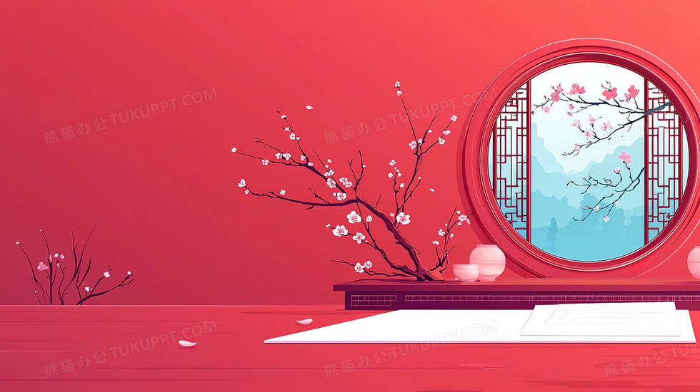 本作品内容为红色中式圆形橱窗梅花背景, 格式为 jpg, 大小2 MB, 图片尺寸为2912 x 1632, 作品中背景图片无需修改, 源文件无水印,可以直接使用, 欢迎使用熊猫办公。 如认为平台内容涉嫌侵权,可通过邮件:tousu@tukuppt.com提出书面通知,我们将及时处理。