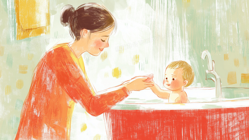 本作品内容为妈妈给宝宝洗澡温馨插画, 格式为 jpg, 大小8 MB, 图片尺寸为2912 x 1632, 源文件无水印, 欢迎使用熊猫办公。 如认为平台内容涉嫌侵权,可通过邮件:tousu@tukuppt.com提出书面通知,我们将及时处理。