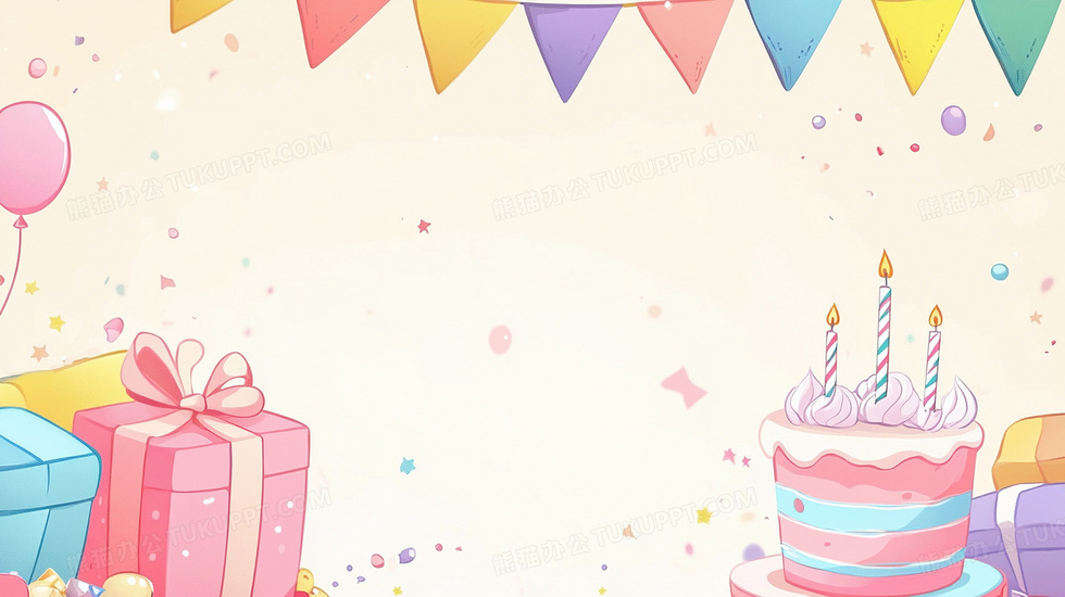 本作品内容为彩旗卡通生日蛋糕派对甜品背景, 格式为 jpg, 大小2 MB, 图片尺寸为2912 x 1632, 作品中背景图片无需修改, 源文件无水印,可以直接使用, 欢迎使用熊猫办公。 如认为平台内容涉嫌侵权,可通过邮件:tousu@tukuppt.com提出书面通知,我们将及时处理。