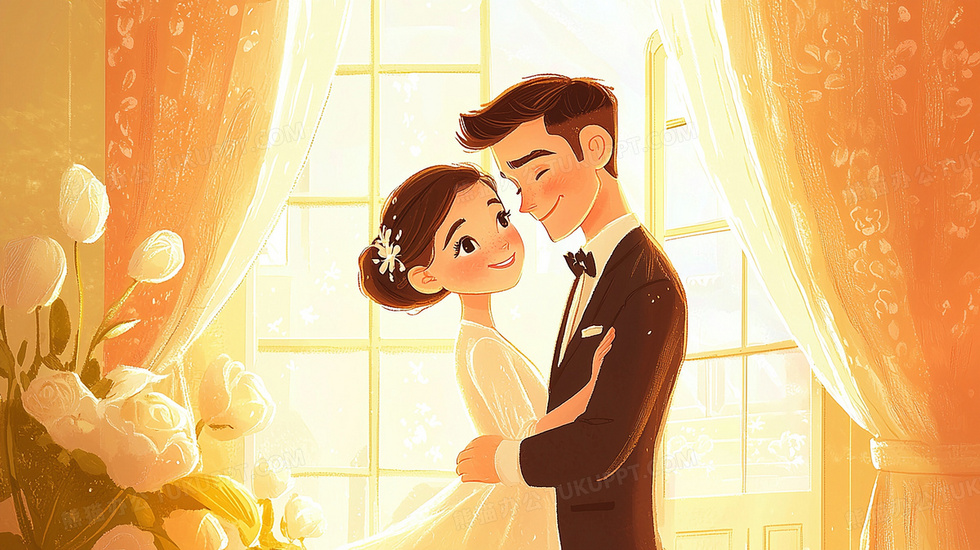 本作品内容为卡通一对新人相视对望温馨浪漫插画, 格式为 jpg, 大小3 MB, 图片尺寸为2912 x 1632, 源文件无水印, 欢迎使用熊猫办公。 如认为平台内容涉嫌侵权,可通过邮件:tousu@tukuppt.com提出书面通知,我们将及时处理。