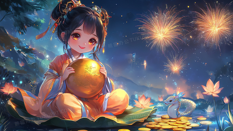 本作品内容为喜庆蛇年荷叶上抱金砖女孩与蛇插画, 格式为 jpg, 大小4 MB, 图片尺寸为2912 x 1632, 源文件无水印, 欢迎使用熊猫办公。 如认为平台内容涉嫌侵权,可通过邮件:tousu@tukuppt.com提出书面通知,我们将及时处理。