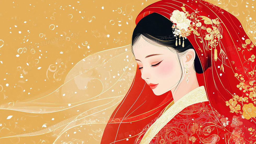本作品内容为中式婚礼新娘红色喜庆装扮插画, 格式为 jpg, 大小4 MB, 图片尺寸为2912 x 1632, 源文件无水印, 欢迎使用熊猫办公。 如认为平台内容涉嫌侵权,可通过邮件:tousu@tukuppt.com提出书面通知,我们将及时处理。