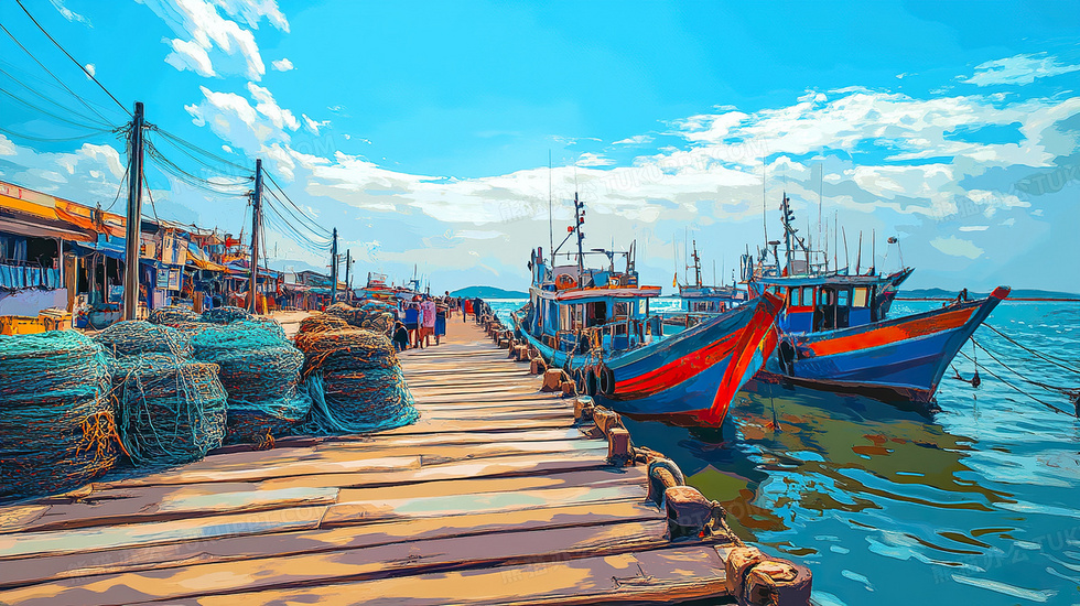 本作品内容为渔业码头场景插画, 格式为 jpg, 大小5 MB, 图片尺寸为2912 x 1632, 源文件无水印, 欢迎使用熊猫办公。 如认为平台内容涉嫌侵权,可通过邮件:tousu@tukuppt.com提出书面通知,我们将及时处理。
