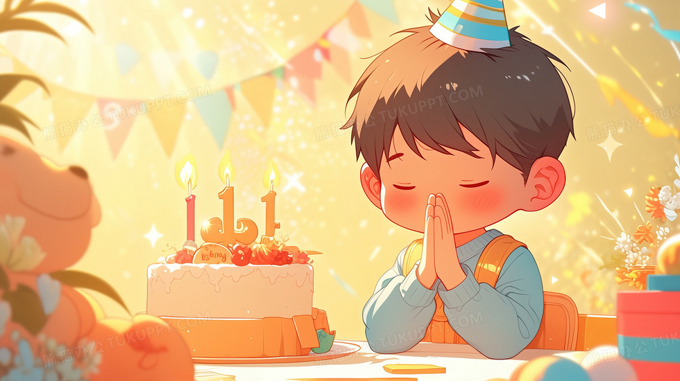 本作品内容为小男孩戴生日帽过生日庆祝许愿插画, 格式为 jpg, 大小2 MB, 图片尺寸为2912 x 1632, 源文件无水印, 欢迎使用熊猫办公。 如认为平台内容涉嫌侵权,可通过邮件:tousu@tukuppt.com提出书面通知,我们将及时处理。