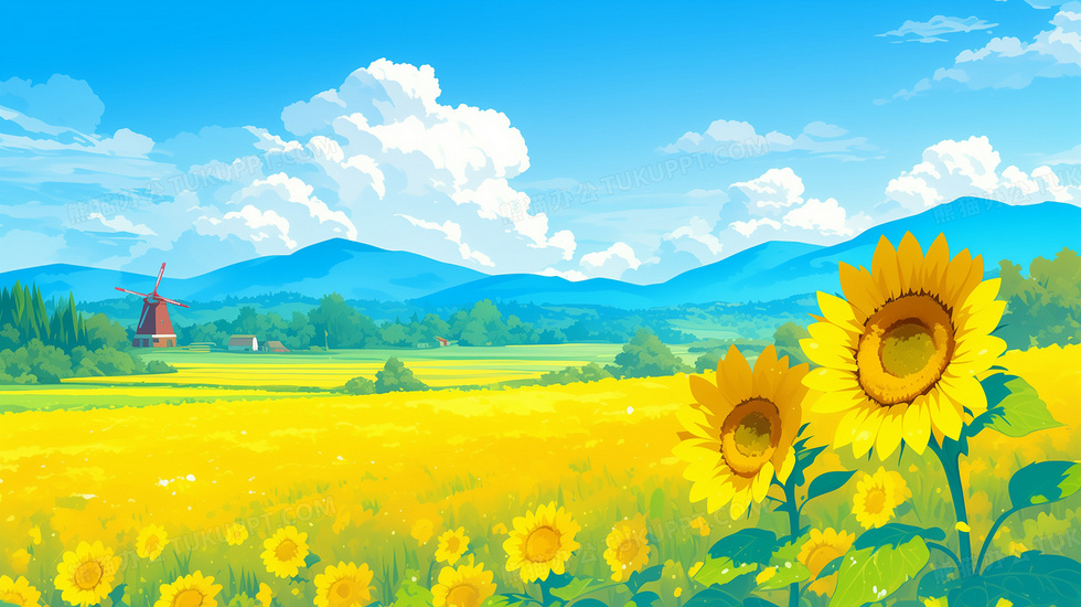 本作品内容为牧场向日葵花海场景插画, 格式为 jpg, 大小4 MB, 图片尺寸为2912 x 1632, 源文件无水印, 欢迎使用熊猫办公。 如认为平台内容涉嫌侵权,可通过邮件:tousu@tukuppt.com提出书面通知,我们将及时处理。