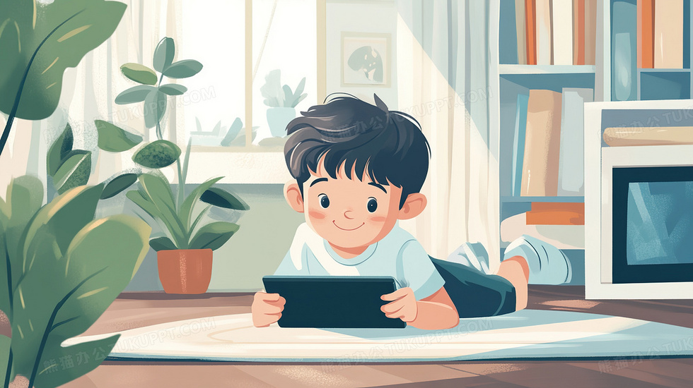 本作品内容为小男孩趴在客厅内玩平板电脑卡通插画, 格式为 jpg, 大小2 MB, 图片尺寸为2912 x 1632, 源文件无水印, 欢迎使用熊猫办公。 如认为平台内容涉嫌侵权,可通过邮件:tousu@tukuppt.com提出书面通知,我们将及时处理。