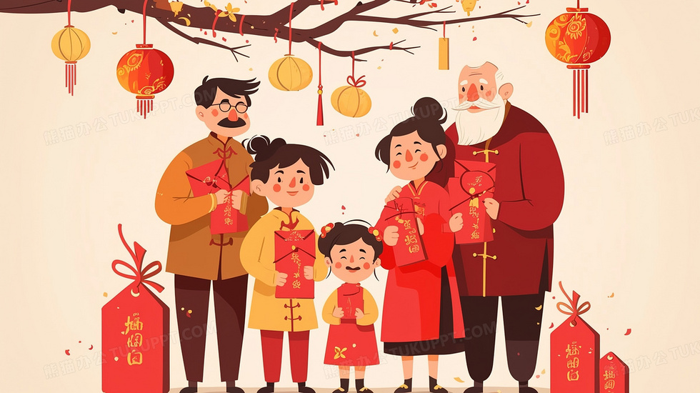 本作品内容为春节抱着小孩拜年的幸福一家人插画, 格式为 jpg, 大小2 MB, 图片尺寸为2912 x 1632, 源文件无水印, 欢迎使用熊猫办公。 如认为平台内容涉嫌侵权,可通过邮件:tousu@tukuppt.com提出书面通知,我们将及时处理。