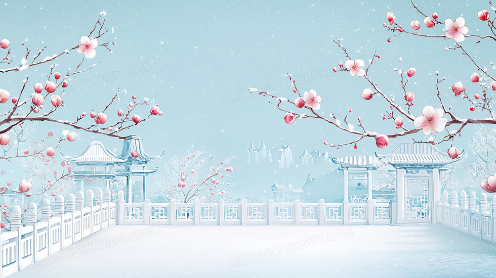 本作品内容为唯美冬季梅花建筑创意背景, 格式为 jpg, 大小3 MB, 图片尺寸为2912 x 1632, 作品中背景图片无需修改, 源文件无水印,可以直接使用, 欢迎使用熊猫办公。 如认为平台内容涉嫌侵权,可通过邮件:tousu@tukuppt.com提出书面通知,我们将及时处理。