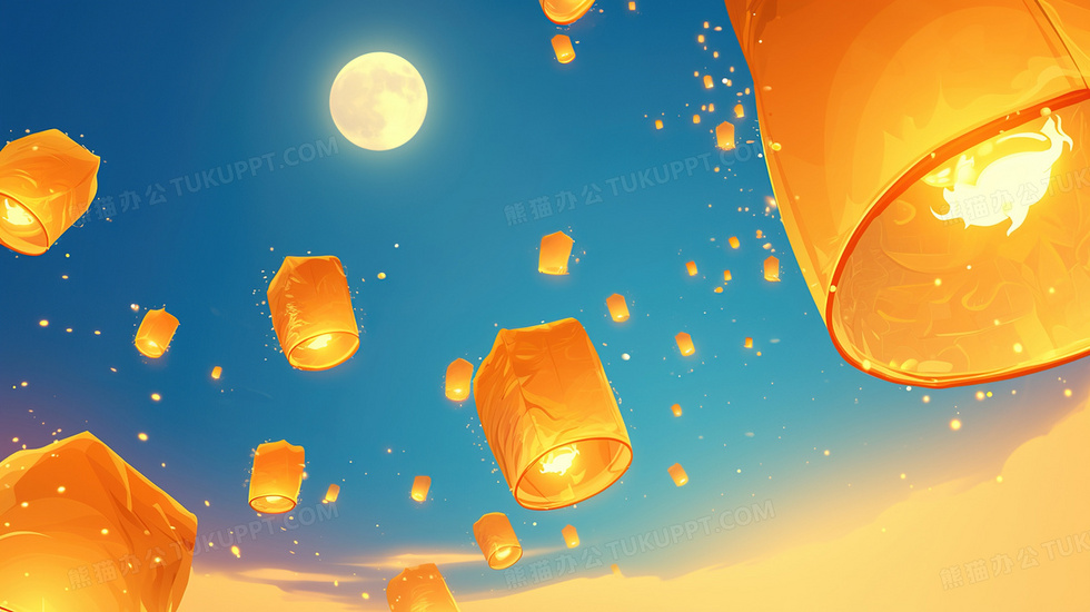 本作品内容为空中飘浮的祈福孔明灯插画, 格式为 jpg, 大小2 MB, 图片尺寸为2912 x 1632, 源文件无水印, 欢迎使用熊猫办公。 如认为平台内容涉嫌侵权,可通过邮件:tousu@tukuppt.com提出书面通知,我们将及时处理。