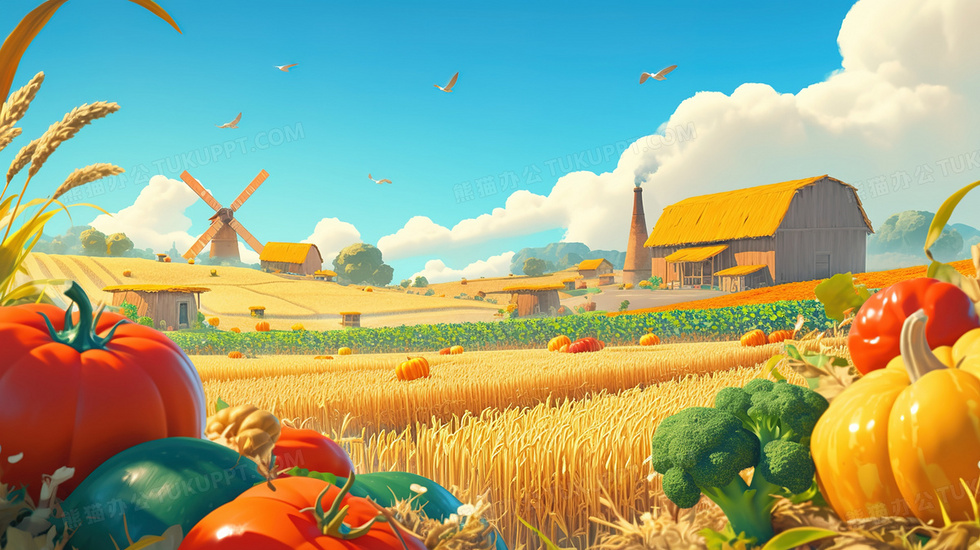本作品内容为蓝天白云农田秋季丰收瓜果插画, 格式为 jpg, 大小3 MB, 图片尺寸为2912 x 1632, 源文件无水印, 欢迎使用熊猫办公。 如认为平台内容涉嫌侵权,可通过邮件:tousu@tukuppt.com提出书面通知,我们将及时处理。