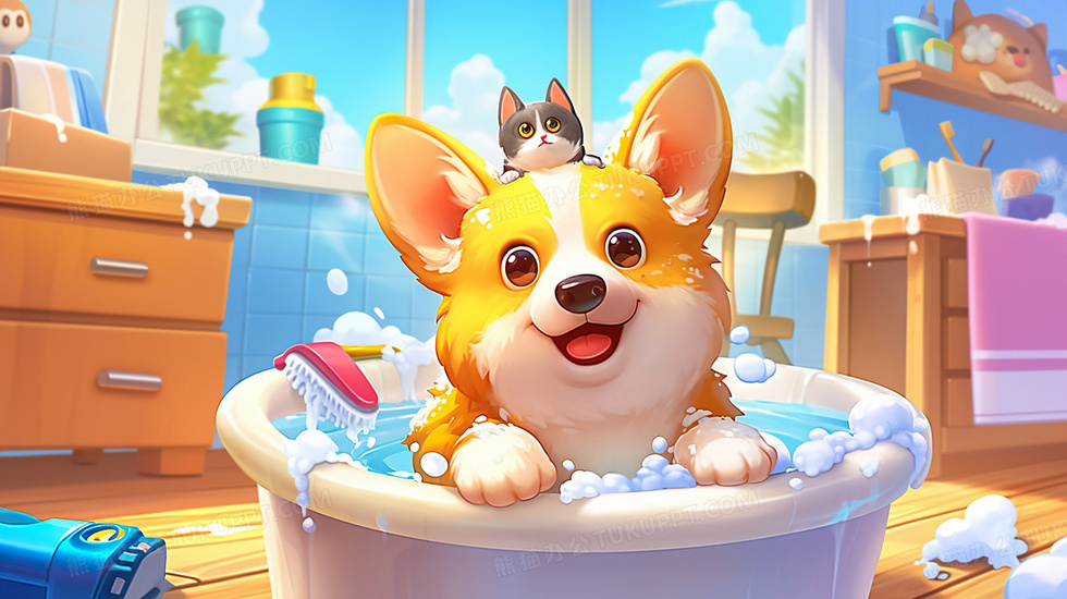 本作品内容为小狗在浴室洗澡宠物插画, 格式为 jpg, 大小3 MB, 图片尺寸为2912 x 1632, 源文件无水印, 欢迎使用熊猫办公。 如认为平台内容涉嫌侵权,可通过邮件:tousu@tukuppt.com提出书面通知,我们将及时处理。