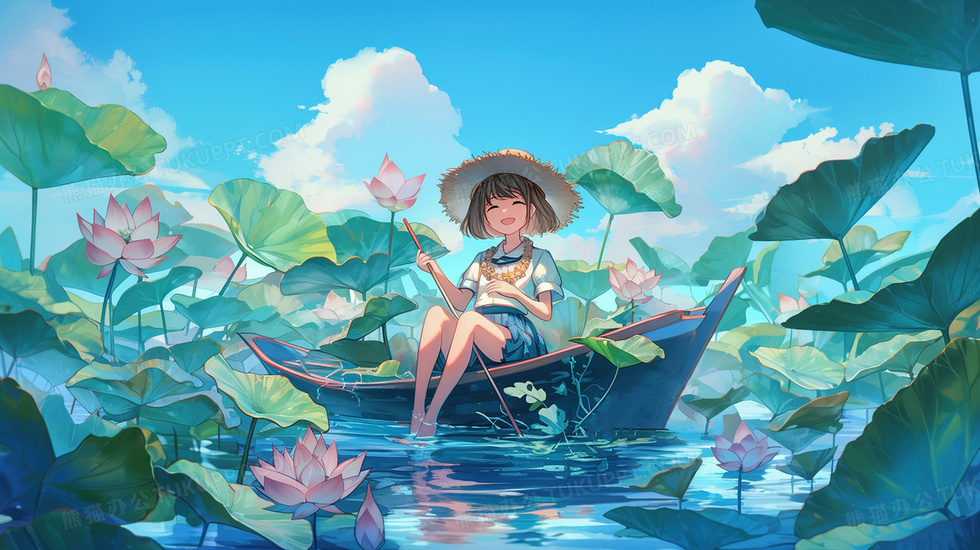 本作品内容为夏季荷塘荷花坐木船的少女插画, 格式为 jpg, 大小3 MB, 图片尺寸为2912 x 1632, 源文件无水印, 欢迎使用熊猫办公。 如认为平台内容涉嫌侵权,可通过邮件:tousu@tukuppt.com提出书面通知,我们将及时处理。