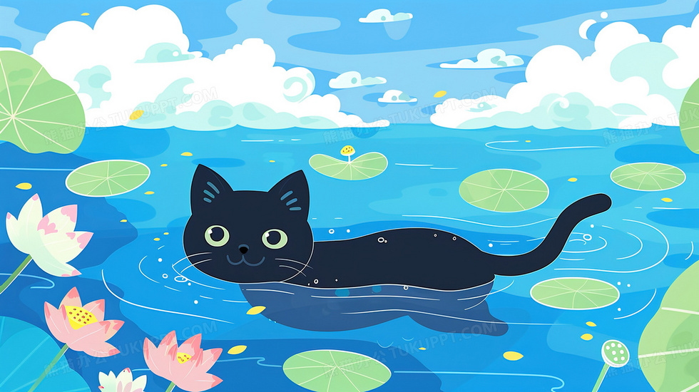 本作品内容为夏季荷塘游泳的宠物黑色猫咪插画, 格式为 jpg, 大小2 MB, 图片尺寸为2912 x 1632, 源文件无水印, 欢迎使用熊猫办公。 如认为平台内容涉嫌侵权,可通过邮件:tousu@tukuppt.com提出书面通知,我们将及时处理。