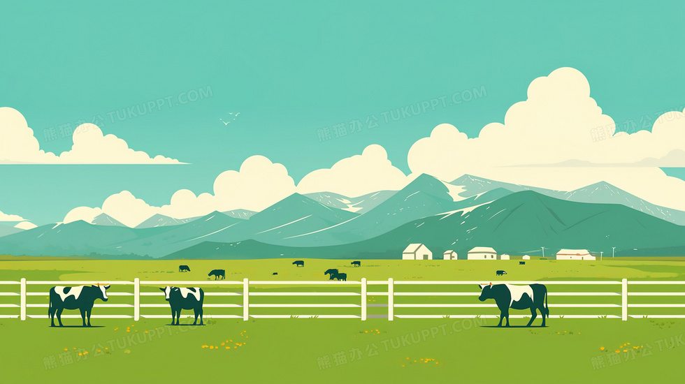 本作品内容为手绘风格奶牛在牧场的背景, 格式为 jpg, 大小2 MB, 图片尺寸为2912 x 1632, 作品中背景图片无需修改, 源文件无水印,可以直接使用, 欢迎使用熊猫办公。 如认为平台内容涉嫌侵权,可通过邮件:tousu@tukuppt.com提出书面通知,我们将及时处理。
