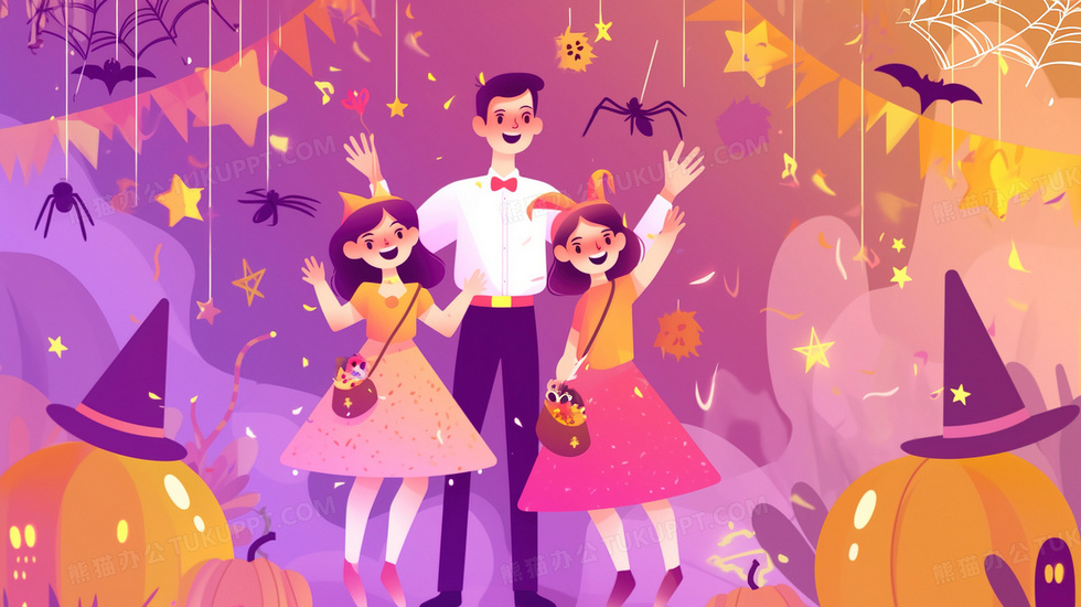 本作品内容为参加万圣节舞会表演的一家人插画, 格式为 jpg, 大小2 MB, 图片尺寸为2912 x 1632, 源文件无水印, 欢迎使用熊猫办公。 如认为平台内容涉嫌侵权,可通过邮件:tousu@tukuppt.com提出书面通知,我们将及时处理。