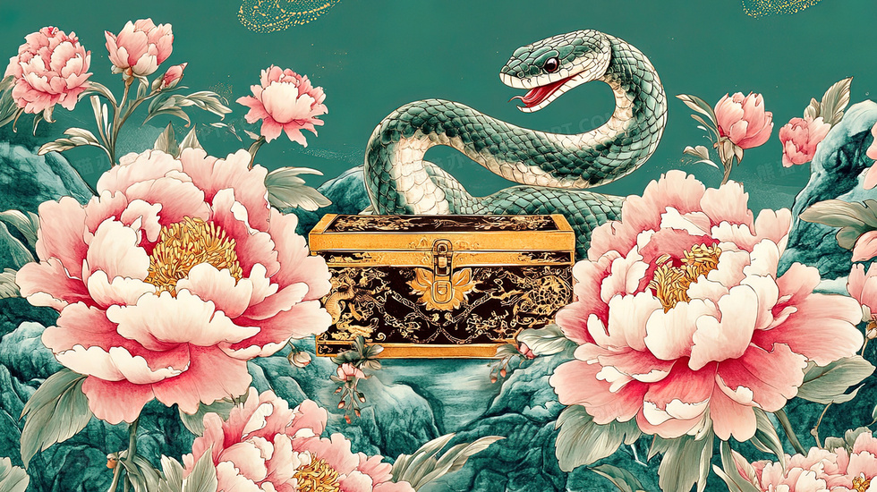 本作品内容为蛇年招财宝箱牡丹花卉与蛇插画, 格式为 jpg, 大小5 MB, 图片尺寸为2912 x 1632, 源文件无水印, 欢迎使用熊猫办公。 如认为平台内容涉嫌侵权,可通过邮件:tousu@tukuppt.com提出书面通知,我们将及时处理。