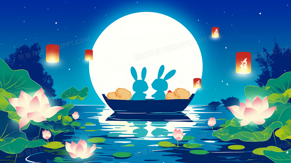 本作品内容为两只月兔在船上赏月吃月饼矢量插画, 格式为 jpg, 大小3 MB, 图片尺寸为2912 x 1632, 源文件无水印, 欢迎使用熊猫办公。 如认为平台内容涉嫌侵权,可通过邮件:tousu@tukuppt.com提出书面通知,我们将及时处理。