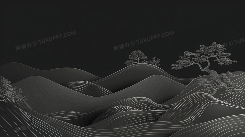 本作品内容为黑色中国风简约山水意境背景, 格式为 jpg, 大小2 MB, 图片尺寸为2912 x 1632, 作品中背景图片无需修改, 源文件无水印,可以直接使用, 欢迎使用熊猫办公。 如认为平台内容涉嫌侵权,可通过邮件:tousu@tukuppt.com提出书面通知,我们将及时处理。