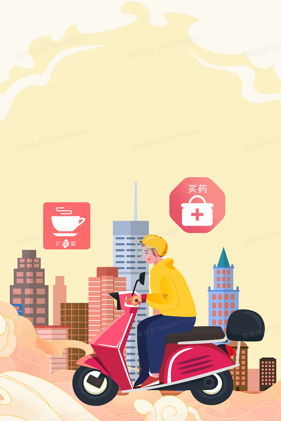 本作品内容为黄色手绘卡通送外卖合成背景, 格式为 psd, 大小40 MB, 图片尺寸为3543 x 5314, 作品中背景图片无需修改, 源文件无水印,可以直接使用, 欢迎使用熊猫办公。 如认为平台内容涉嫌侵权,可通过邮件:tousu@tukuppt.com提出书面通知,我们将及时处理。