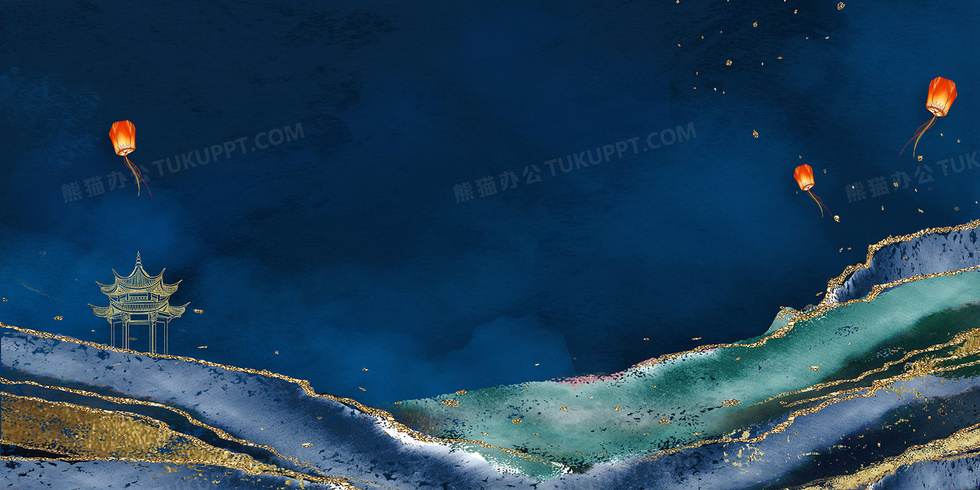 本作品内容为雅致中国风新中式鎏金山水亭子孔明灯背景, 格式为 psd, 大小138 MB, 图片尺寸为4724 x 2362, 作品中背景图片无需修改, 源文件无水印,可以直接使用, 欢迎使用熊猫办公。 如认为平台内容涉嫌侵权,可通过邮件:tousu@tukuppt.com提出书面通知,我们将及时处理。