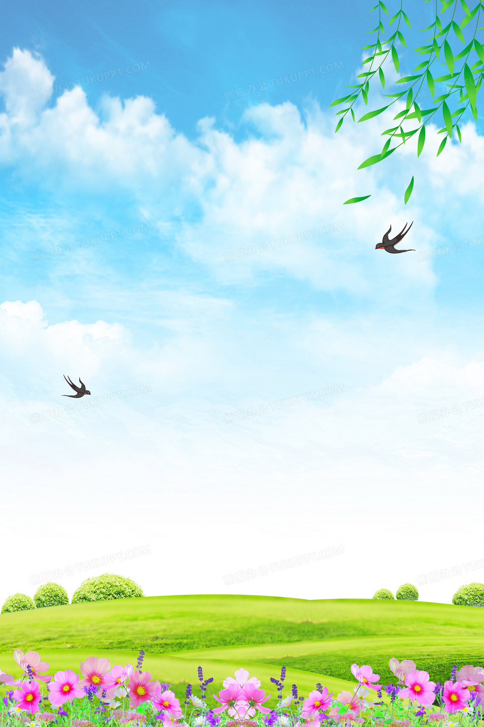 本作品内容为春天柳叶燕子草地花草摄影图合成背景, 格式为 psd, 大小46 MB, 图片尺寸为3543 x 5315, 作品中背景图片无需修改, 源文件无水印,可以直接使用, 欢迎使用熊猫办公。 如认为平台内容涉嫌侵权,可通过邮件:tousu@tukuppt.com提出书面通知,我们将及时处理。