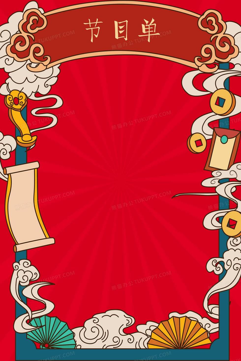 本作品内容为红色嘻哈国潮新年节目单背景, 格式为 psd, 大小5 MB, 图片尺寸为2362 x 3543, 作品中背景图片无需修改, 源文件无水印,可以直接使用, 欢迎使用熊猫办公。 如认为平台内容涉嫌侵权,可通过邮件:tousu@tukuppt.com提出书面通知,我们将及时处理。
