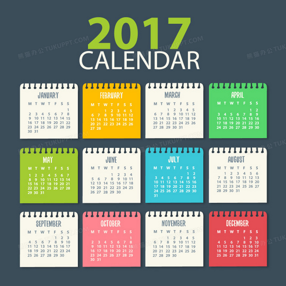 本作品内容为2017彩色简洁商务日历背景素材, 格式为 eps, 图片尺寸为2001 x 2001, 作品中背景图片无需修改, 源文件无水印,可以直接使用, 欢迎使用熊猫办公。 如认为平台内容涉嫌侵权,可通过邮件:tousu@tukuppt.com提出书面通知,我们将及时处理。