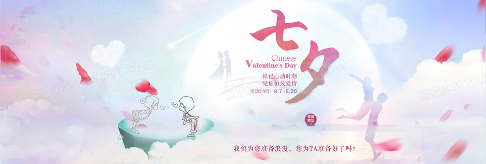 本作品内容为浪漫 七夕海报banner背景, 格式为 psd, 图片尺寸为1920 x 650, 作品中背景图片无需修改, 源文件无水印,可以直接使用, 欢迎使用熊猫办公。 如认为平台内容涉嫌侵权,可通过邮件:tousu@tukuppt.com提出书面通知,我们将及时处理。