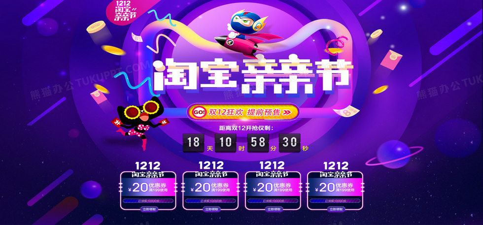 本作品内容为紫色淘宝亲亲节双12首页装修双十二模板, 格式为 psd, 图片尺寸为1920 x 895, 作品中背景图片无需修改, 源文件无水印,可以直接使用, 欢迎使用熊猫办公。 如认为平台内容涉嫌侵权,可通过邮件:tousu@tukuppt.com提出书面通知,我们将及时处理。