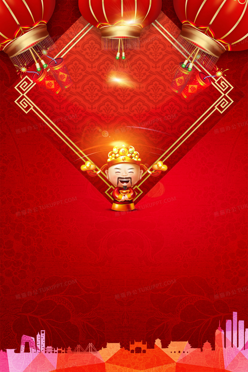 本作品内容为红色喜庆财神迎新年海报背景素材, 格式为 psd, 图片尺寸为2362 x 3543, 作品中背景图片无需修改, 源文件无水印,可以直接使用, 欢迎使用熊猫办公。 如认为平台内容涉嫌侵权,可通过邮件:tousu@tukuppt.com提出书面通知,我们将及时处理。