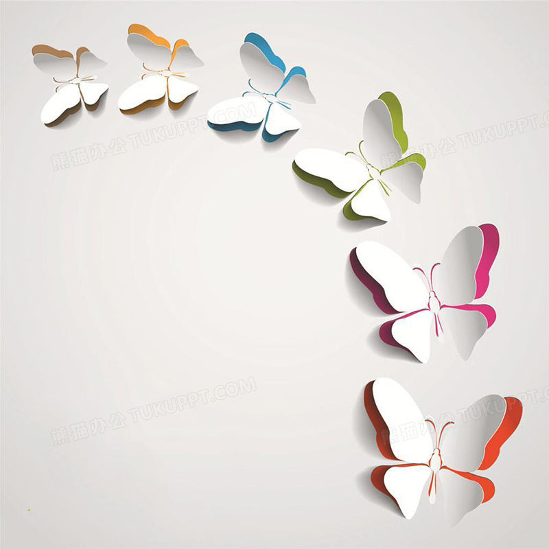 本作品内容为彩色半立体纸雕镂空蝴蝶, 格式为 jpg, 图片尺寸为800 x 800, 作品中背景图片无需修改, 源文件无水印,可以直接使用, 欢迎使用熊猫办公。 如认为平台内容涉嫌侵权,可通过邮件:tousu@tukuppt.com提出书面通知,我们将及时处理。