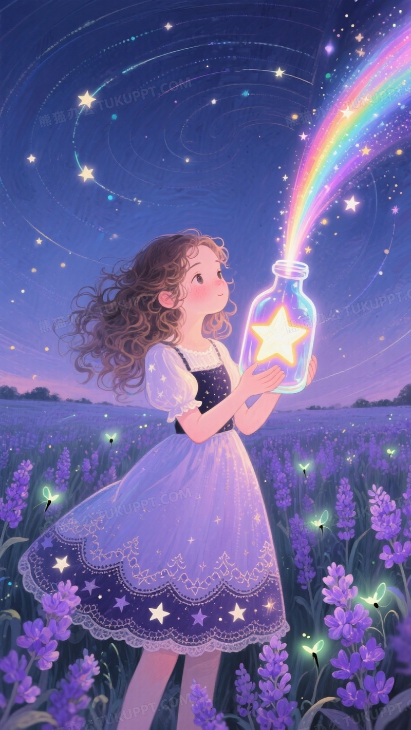 童话风发光手绘插画卷发女孩在薰衣草田捧星形许愿瓶