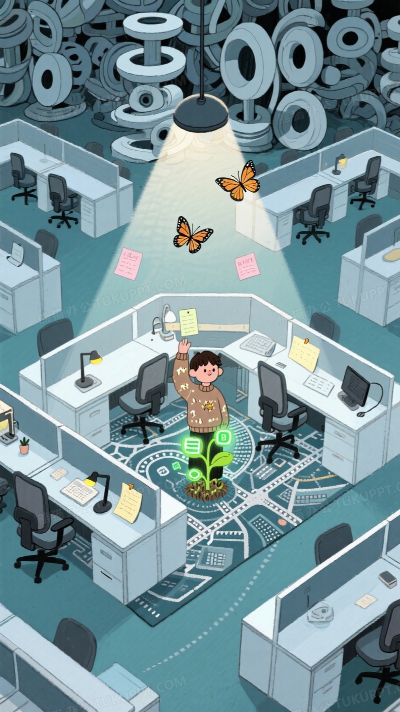 本作品内容为绘本风加班场景俯视角展示L形工位迷宫, 格式为 jpg, 大小1 MB, 图片尺寸为936 x 1664, 源文件无水印, 欢迎使用熊猫办公。 如认为平台内容涉嫌侵权,可通过邮件:tousu@tukuppt.com提出书面通知,我们将及时处理。