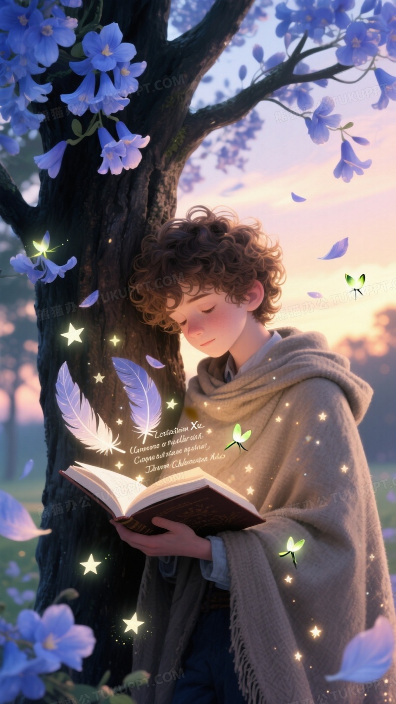 本作品内容为治愈系童话风格卷发少年倚靠开满蓝花楹的树干阅读, 格式为 jpg, 大小1 MB, 图片尺寸为936 x 1664, 源文件无水印, 欢迎使用熊猫办公。 如认为平台内容涉嫌侵权,可通过邮件:tousu@tukuppt.com提出书面通知,我们将及时处理。
