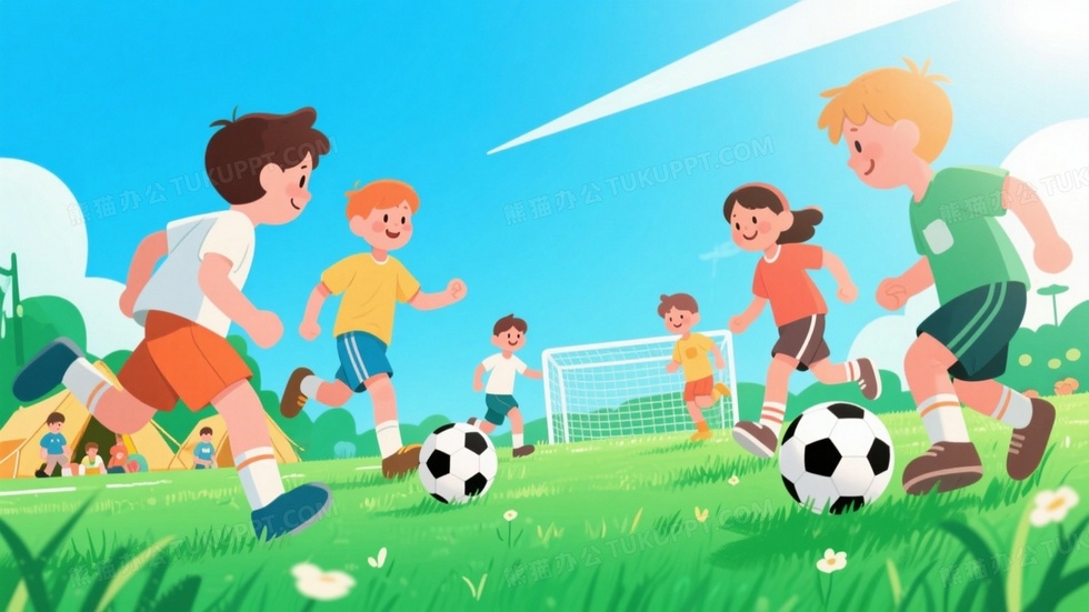本作品内容为好看的高清插画描绘夏令营里孩子们在草地上进行足球比赛, 格式为 jpg, 大小1 MB, 图片尺寸为1664 x 936, 源文件无水印, 欢迎使用熊猫办公。 如认为平台内容涉嫌侵权,可通过邮件:tousu@tukuppt.com提出书面通知,我们将及时处理。